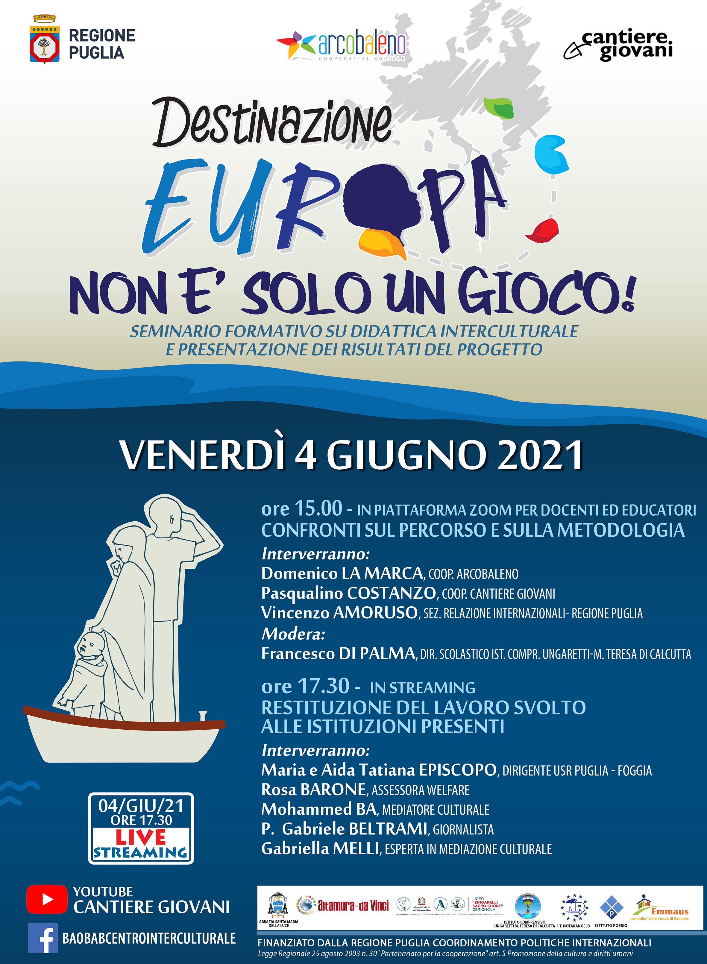 Finanziato dalla Regione Puglia, Sezione Relazioni Politiche e Relazioni Internazionali con Programma annuale 2019/Avviso Pubblico L.R. 20/2003. Art. 5. “Destinazione Europa” è uno strumento creato con le scuole e messo a disposizione delle stesse, per parlare di diritti, di squilibri Nord-Sud del Mondo, di migrazione, viaggiando con cercatori di speranza, donne e uomini veri le cui storie sono state raccolte e hanno servito di ispirazione.