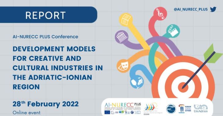 La Conferenza AI-NURECC PLUS “Development models for creative and cultural industries in the Adriatic-Ionian region” si è tenuta il 28 febbraio 2022, organizzato da: Forum delle Camere di Commercio dell'Adriatico e dello Ionio, UniAdrion e FAIC, partner della Rete di Università, Regioni, Camere di Commercio e Città PLUS dell'Adriatico Ionio (iniziativa AI-NURECC PLUS).