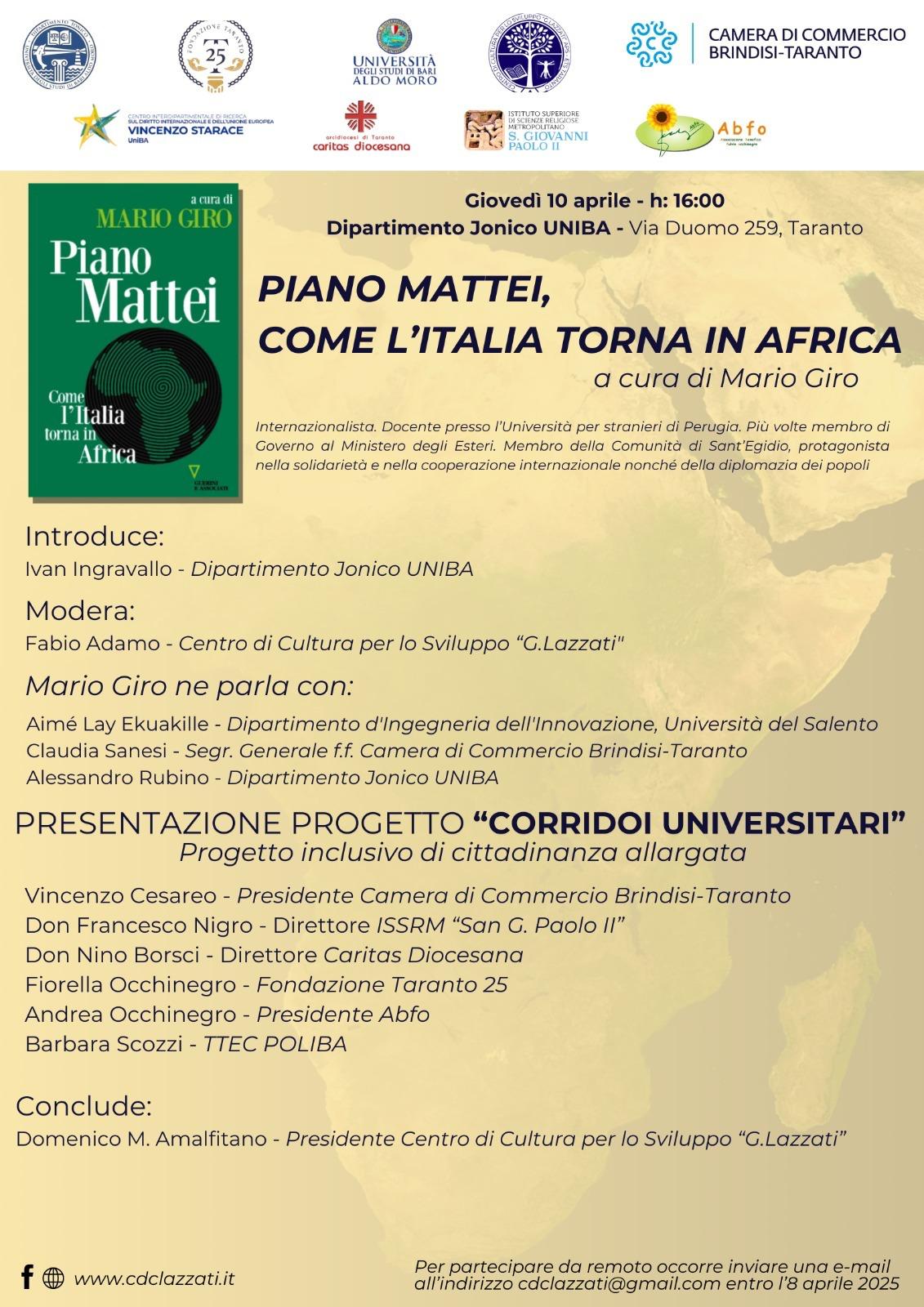 Giovedì 10 aprile, con inizio alle ore 16,00 avremo - presso il Dipartimento Jonico in Sistemi giuridici ed economici del Mediterraneo: società, ambiente, culture, nella sede di Taranto dell’Università di Bari Aldo Moro, in via Duomo 259 - avrà luogo un incontro a con Mario Giro, autore di Piano Mattei. Come l'Italia torna in Africa.