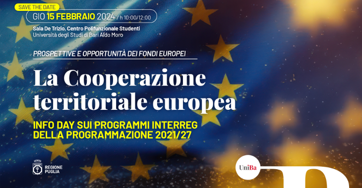 Giovedì 15 febbraio 2024 dalle ore 10.00 nella Sala “De Trizio” del Centro Polifunzionale Studenti dell'Università degli Studi di "Bari Aldo Moro" (Piazza Cesare Battisti, Bari) si svolgerà l'evento "La Cooperazione territoriale europea: info Day sui Programmi INTERREG della programmazione 2021/2027".