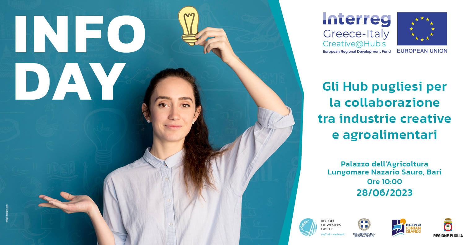 Il 28 giugno dalle ore 10, nella sede del Dipartimento Agricoltura, Sviluppo Rurale e Ambientale - Lungomare Nazario Sauro 47-, avrà luogo un incontro informativo dedicato all’Azione Strategica del Programma di Cooperazione Interreg V-A Grecia-Italia “CREATIVE@HUBS Holistic networking of creative industries via Hubs”.