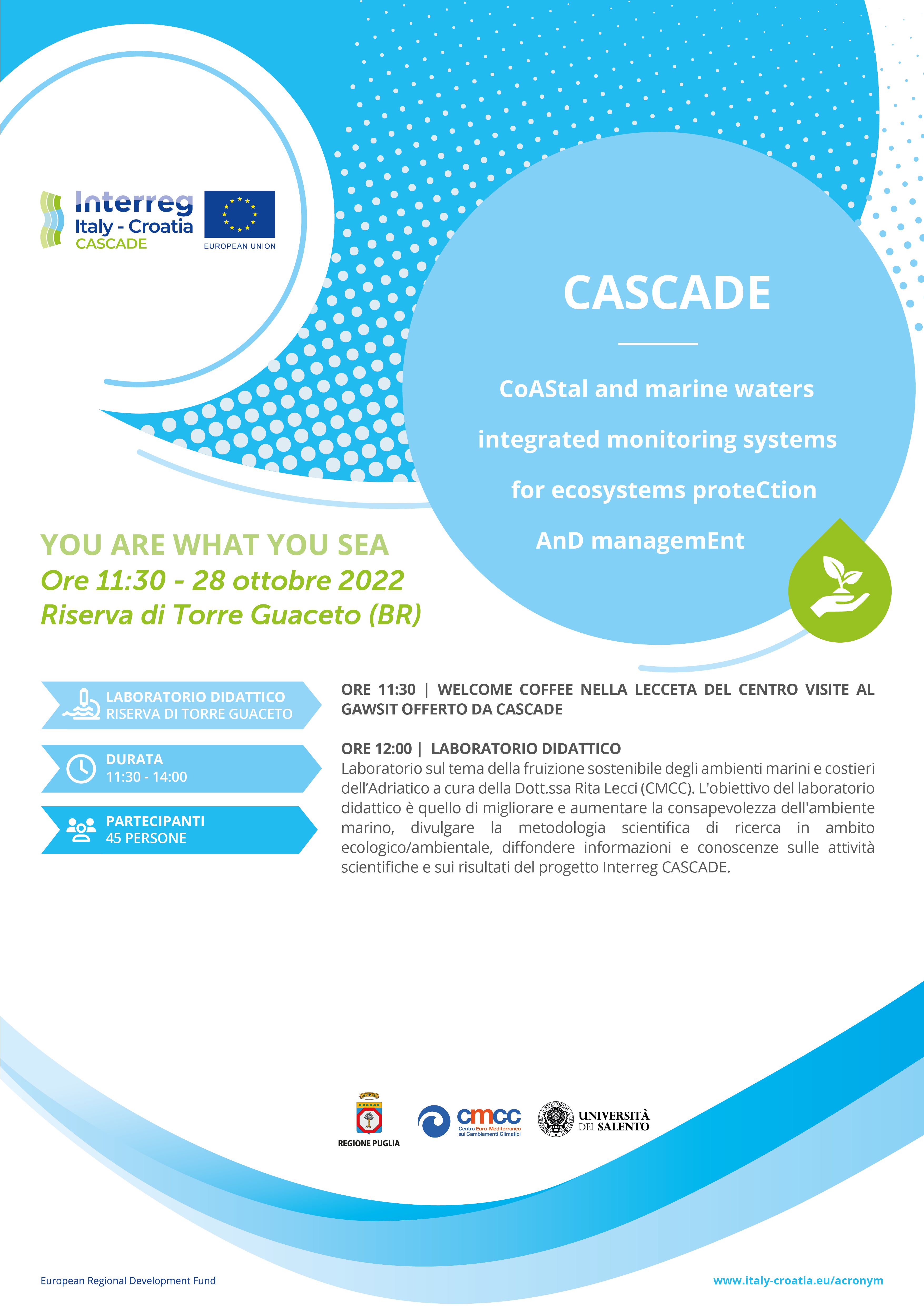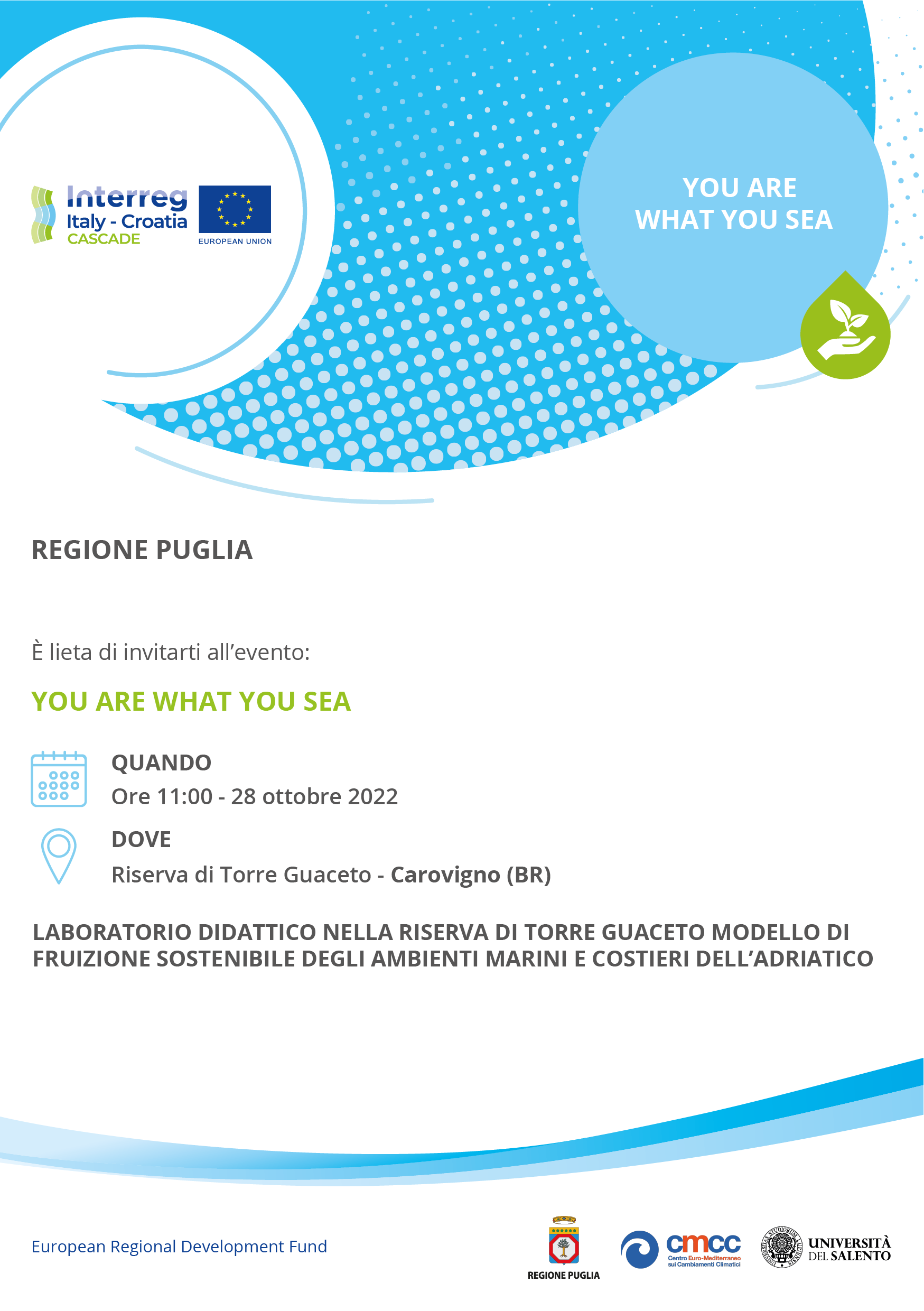 L'evento è realizzato dalla Regione Puglia con la collaborazione del Centro euro-Mediterraneo sui Cambiamenti Climatici (CMCC) nell'ambito del progetto CASCADE – “CoAStal and marine waters integrated monitoring systems for ecosystems proteCtion AnD management” finanziato dal Programma di Cooperazione Interreg V-A Italia-Croazia 2014-2020.