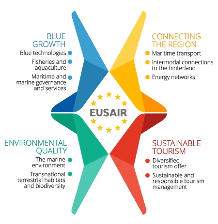 Eusair promuove la crescita e la prosperità economiche della regione migliorandone l'attrattività, la competitività e la connettività. Si propone, inoltre, la salvaguardia del mare, dell'ambiente costiero e dell'entroterra e degli ecosistemi.
