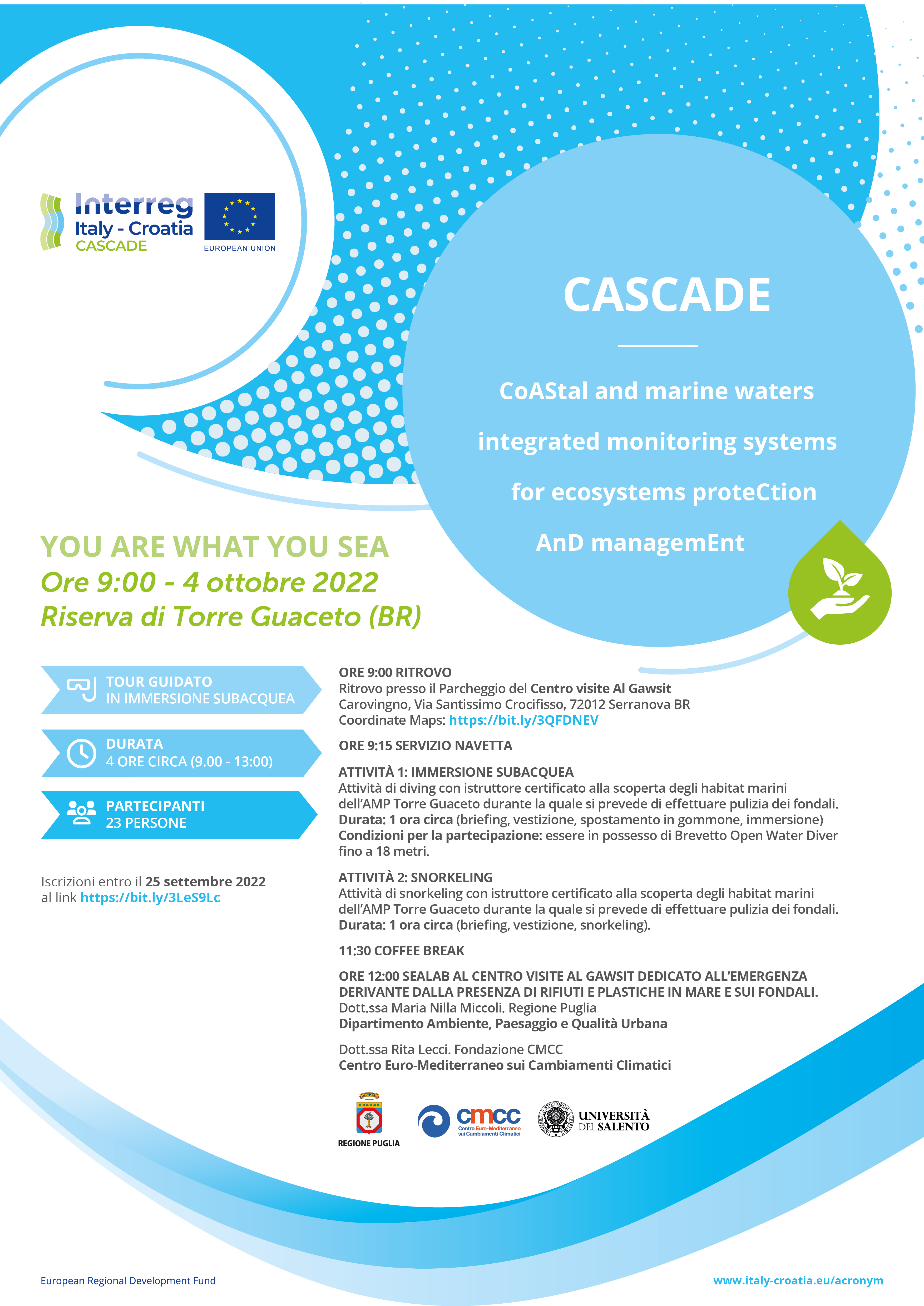 CASCADE, acronimo di “CoAStal and marine waters integrated monitoring systems for ecosystems proteCtion AnD management”, è finanziato dal Programma di cooperazione Interreg Italia-Croazia e, sotto la guida della Regione Puglia, vede coinvolti altri 19 partner provenienti dai due Stati che si affacciano sull’Adriatico e includono istituzioni pubbliche (regioni e contee, agenzie, città costiere), università, centri di ricerca e organizzazioni ambientaliste.