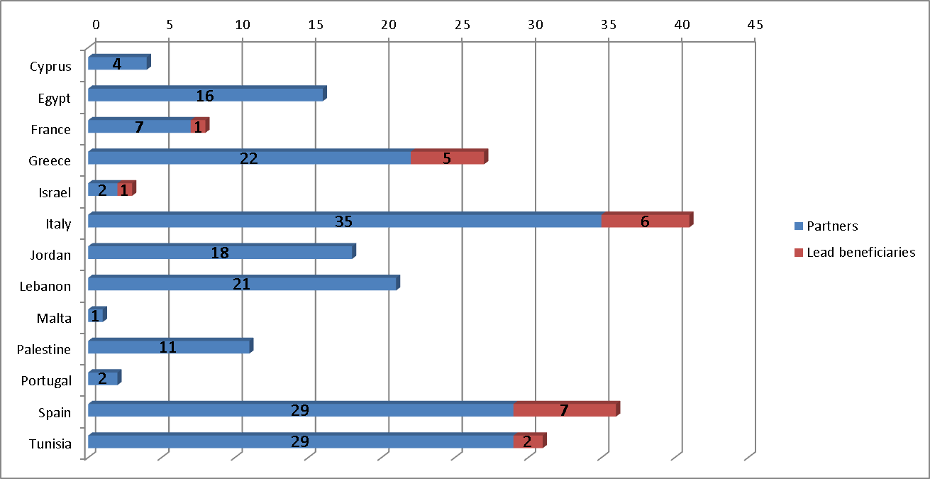 I progetti Strategici selezionati riuniscono 197 attori provenienti dai territori ammissibili dei 13 paesi partecipanti al Programma ENI CBC Med, ovvero: Cipro, Egitto, Francia, Grecia, Israele, Italia, Giordania, Libano, Malta, Portogallo, Palestina, Spagna e Tunisia. L’Italia registra, in totale, il coinvolgimento in ben 35 partenariati, in 6 dei quali lavorerà in qualità di Lead beneficiary.
