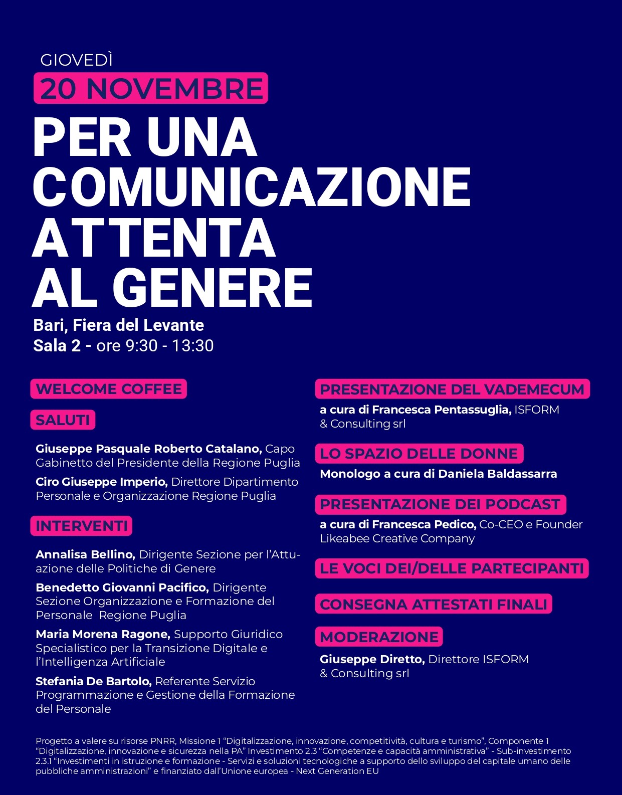 Oggi, giovedì 20 novembre, con un evento alla Fiera del Levante di Bari (Padiglione 152 – Sala 2), si conclude il percorso formativo per dipendenti regionali intitolato “Per una comunicazione pubblica attenta al Genere”.