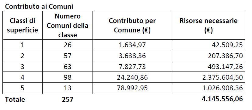 Per i Comuni, il contributo viene calcolato sulla base della superficie territoriale, suddividendo gli enti in cinque classi dimensionali e attribuendo le risorse in proporzione ai chilometri quadrati, così da garantire un sostegno adeguato alle diverse realtà territoriali.