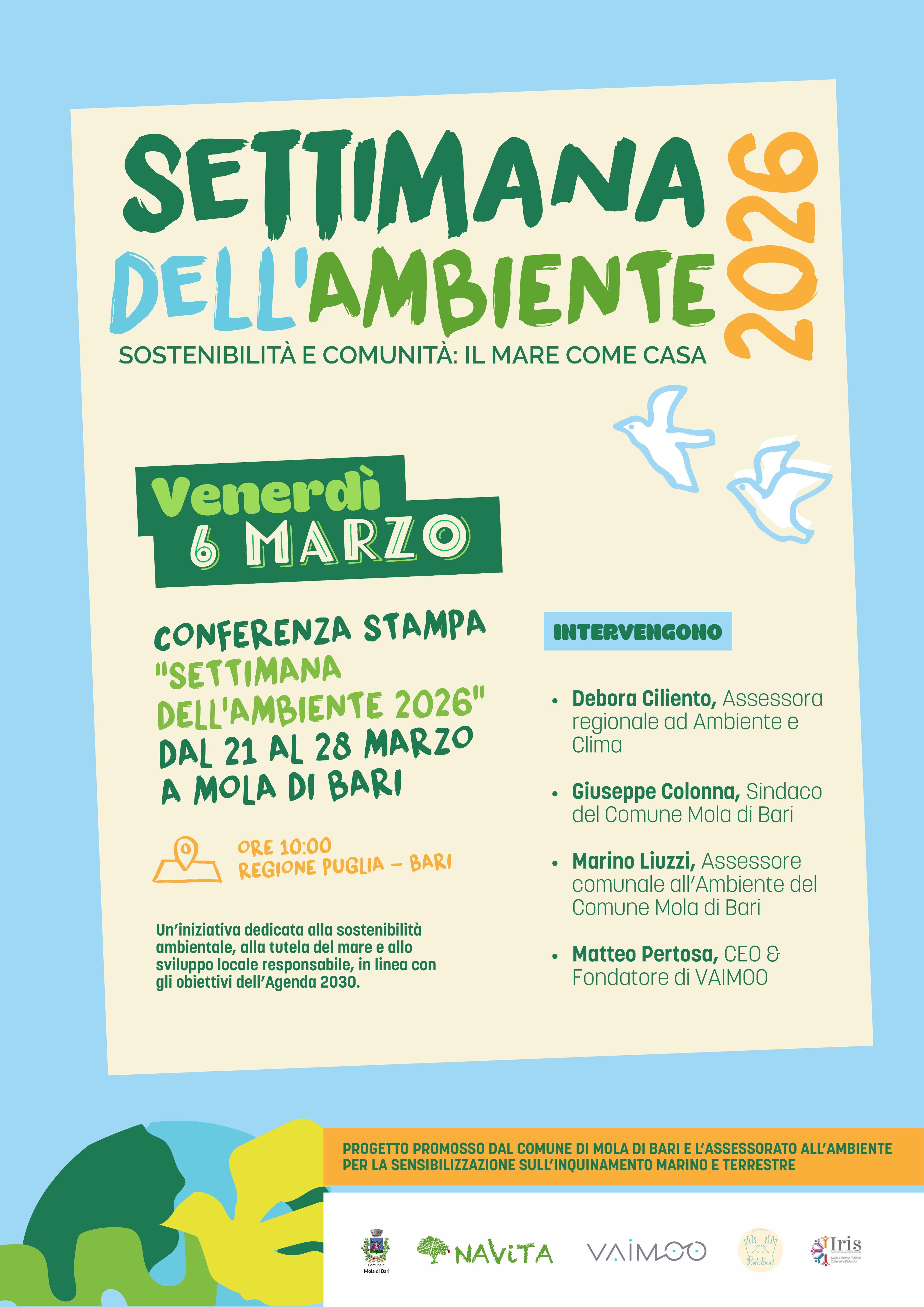 "La Settimana dell'Ambiente 2026 - Sostenibilità e comunità: il mare come casa" è organizzata e promossa dal Comune di Mola di Bari-Assessorato all'Ambiente in collaborazione con Navita, Vaimoo, Pekaboo e Società Cooperativa Sociale Iris, ed è in programma dal 21 al 28 marzo a Mola di Bari. Si configura come iniziativa di rilevanza pubblica finalizzata alla sensibilizzazione della cittadinanza sui temi della sostenibilità ambientale, della tutela del mare e dello sviluppo locale responsabile. La kermesse si inserisce nel quadro degli obiettivi di sviluppo sostenibile dell’Agenda 2030 e intende rafforzare il ruolo del Comune di Mola di Bari quale ente promotore di buone pratiche ambientali attraverso un percorso condiviso con la comunità locale.