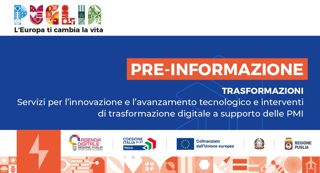 Con Deliberazione n. 708 del 28/05/2024, pubblicata sul BURP n.46 del 6/06/2024, la Giunta Regionale ha approvato la scheda di pre-informazione dell’ Avviso TRASFORMAZIONI “Servizi per l’innovazione e l’avanzamento tecnologico e interventi di trasformazione digitale a supporto delle PMI”, nell'ambito dell' Asse Prioritario I - “Competitività e Innovazione” – Azione 1.2 “Servizi per l’innovazione e l’avanzamento tecnologico delle PMI” e Azione 1.7 “Interventi di digitalizzazione delle imprese” del PR FESR-FSE+ 2021-2027: