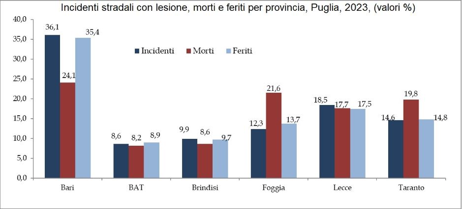 "Nel 2023 le strade pugliesi sono state teatro di 9.843 incidenti stradali con lesione, di cui 206 mortali, che hanno provocato 232 vittime (+2%) così ripartite: 166 conducenti, 45 persone trasportate, 21 pedoni e 14.918 feriti (+4%). In media, 27 incidenti con lesioni al giorno.